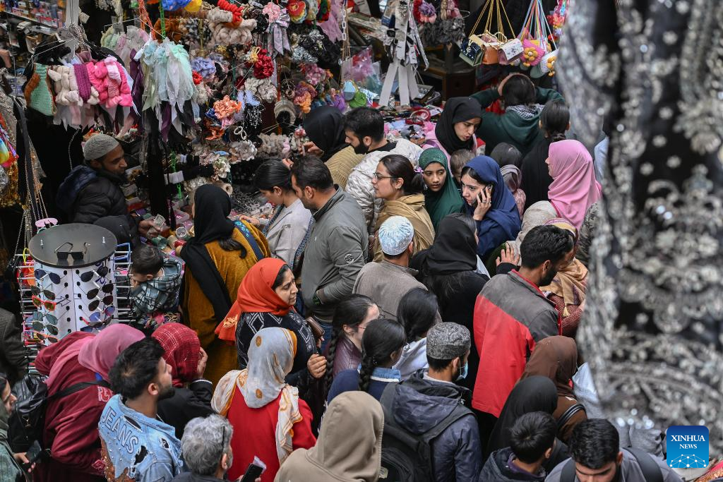 People throng a market for shopping ahead of the Eid al-Fitr in Srinagar, the summer capital of Indian-controlled Kashmir, March 17, 2026. (Xinhua/Javed Dar)