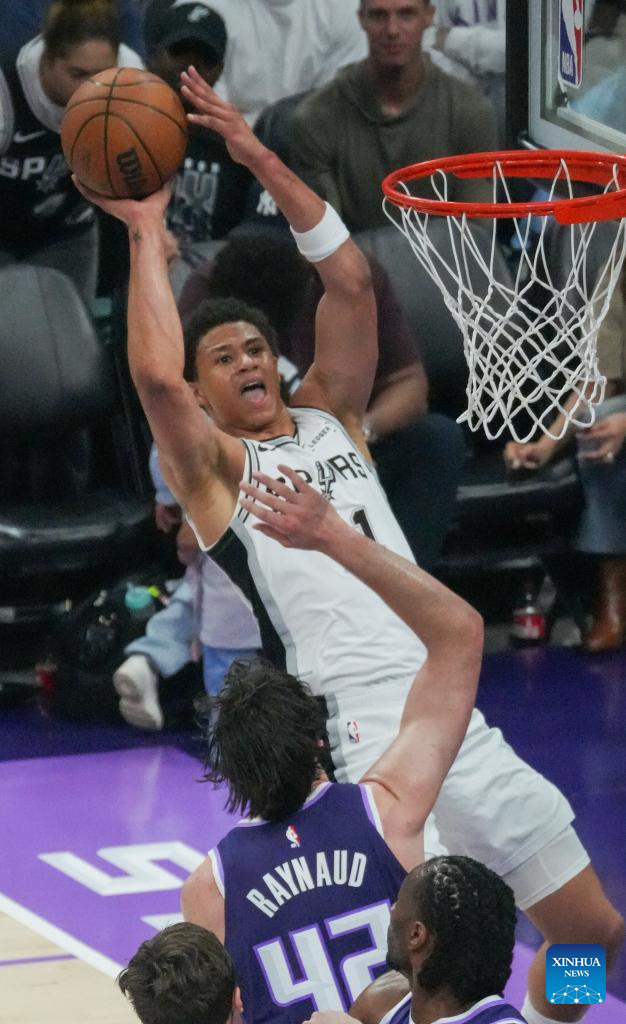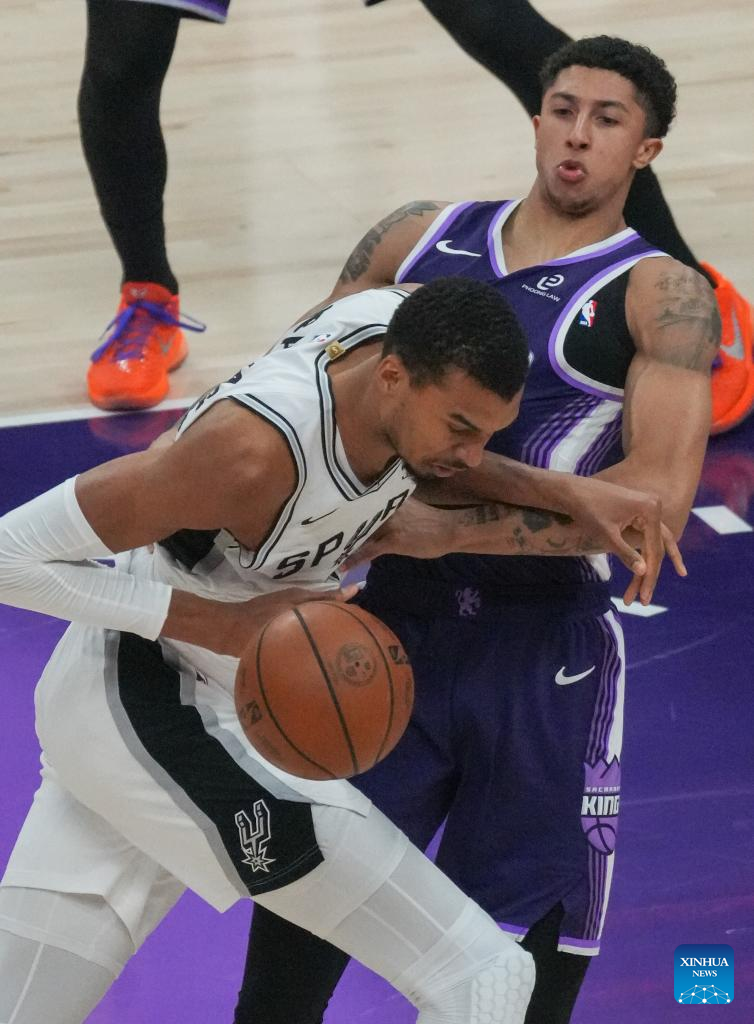 Victor Wembanyama (L) of San Antonio Spurs competes during the 2025-2026 NBA regular season game between Sacramento Kings and San Antonio Spurs in Sacramento, the United States, March 17, 2026. (Photo by Sun Yuxuan/Xinhua)