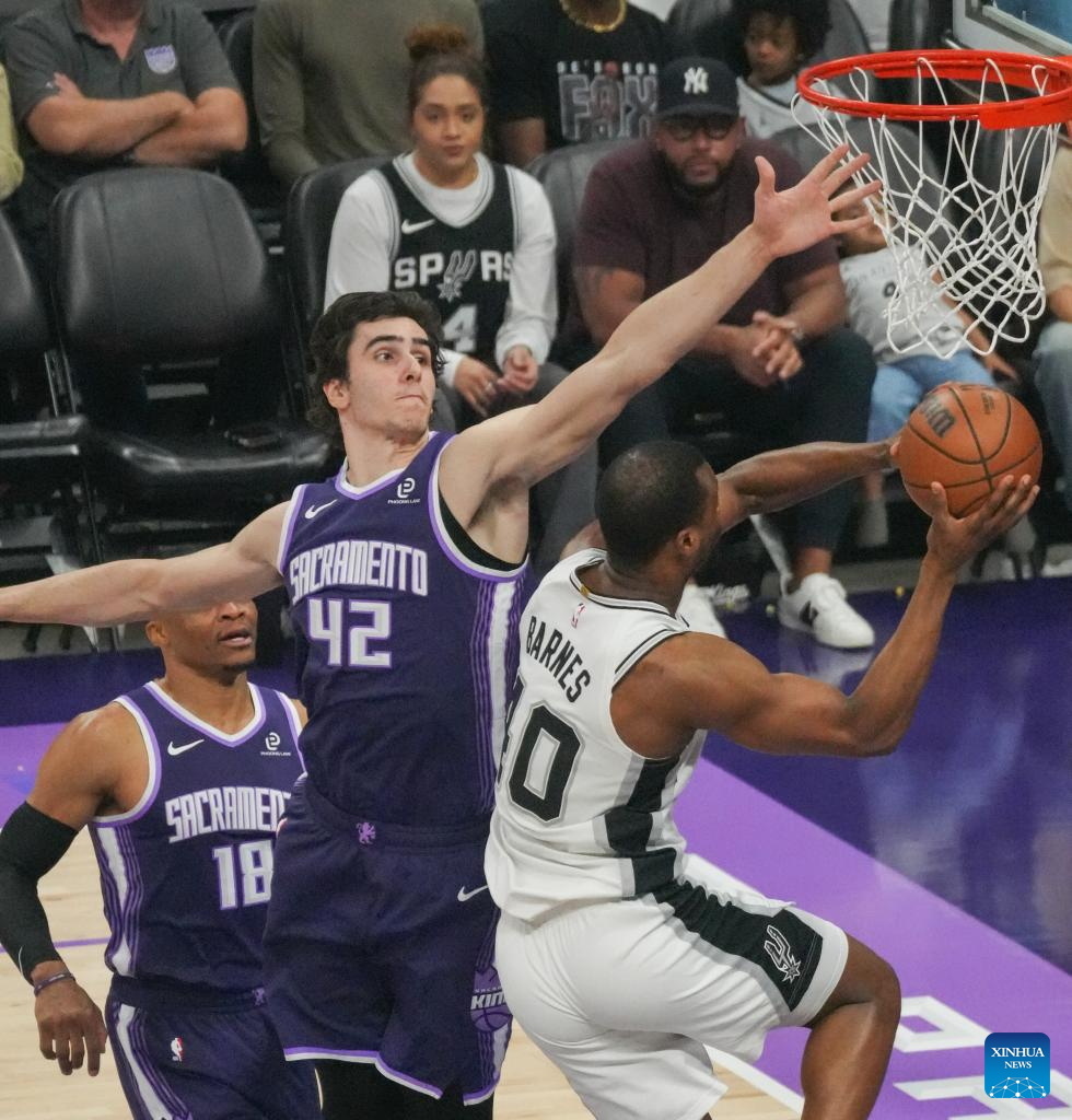 Maxime Raynaud (front L) of Sacramento Kings defends Harrison Barnes (front R) of San Antonio Spurs during the 2025-2026 NBA regular season game between Sacramento Kings and San Antonio Spurs in Sacramento, the United States, March 17, 2026. (Photo by Sun Yuxuan/Xinhua)