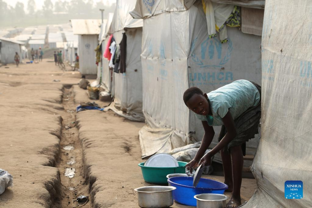 A refugee washes clothes in a camp for internally displaced persons (IDPs) in Ituri province, northeastern Democratic Republic of the Congo, March 17, 2022. Despite all the challenges, peace and state authority will be restored in Ituri, a violence-laden province in northeastern Democratic Republic of the Congo (DRC), reassured Lieutenant-General Johnny Luboya, Ituri's military governor, in a recent exclusive interview with Xinhua. (Photo by Alain Uaykani/Xinhua)