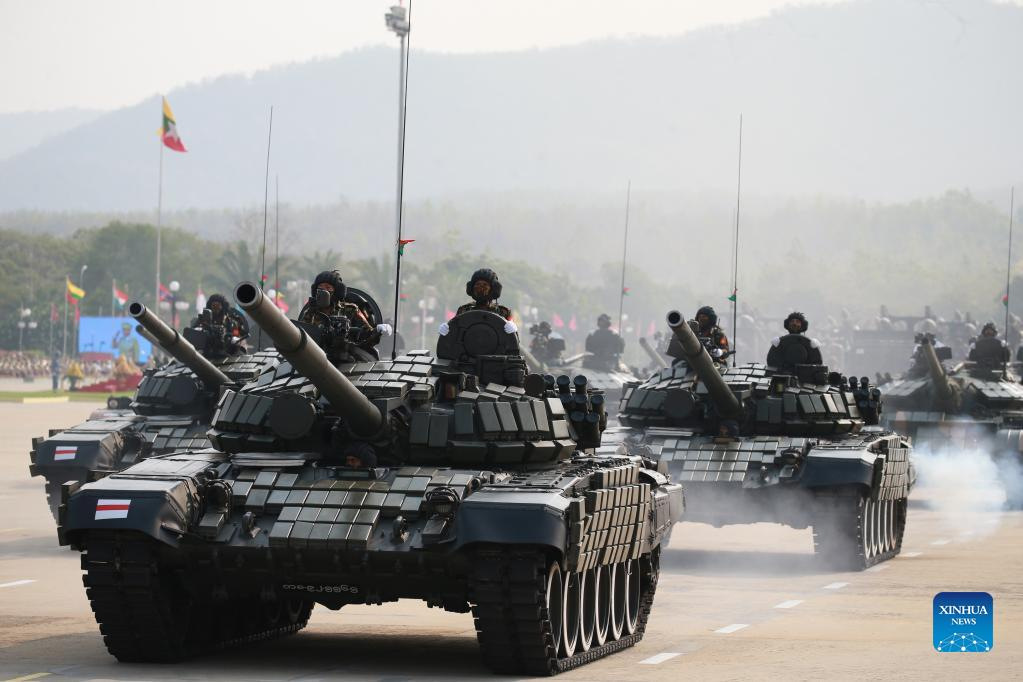 Military vehicles march in a formation during a military parade to mark the 77th Armed Forces Day in Nay Pyi Taw, capital of Myanmar, March 27, 2022. Myanmar marked the 77th Armed Forces Day with a military parade in the capital city of Nay Pyi Taw on Sunday. (Xinhua/U Aung)