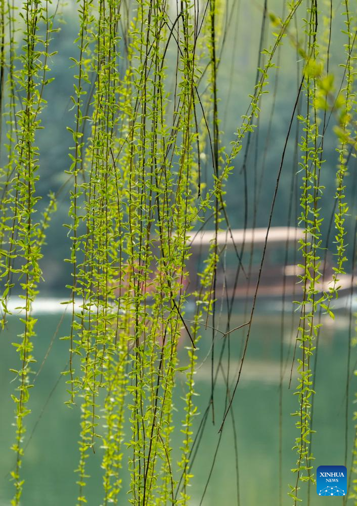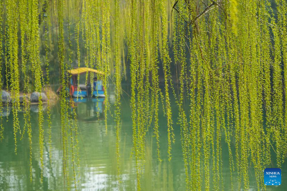 This photo taken on March 17, 2026 shows the scenery around the Daming Lake in Jinan, east China's Shandong Province. Willow trees around the Daming Lake have turned green as temperature rises, attracting tourists for sightseeing. (Xinhua/Xu Suhui)