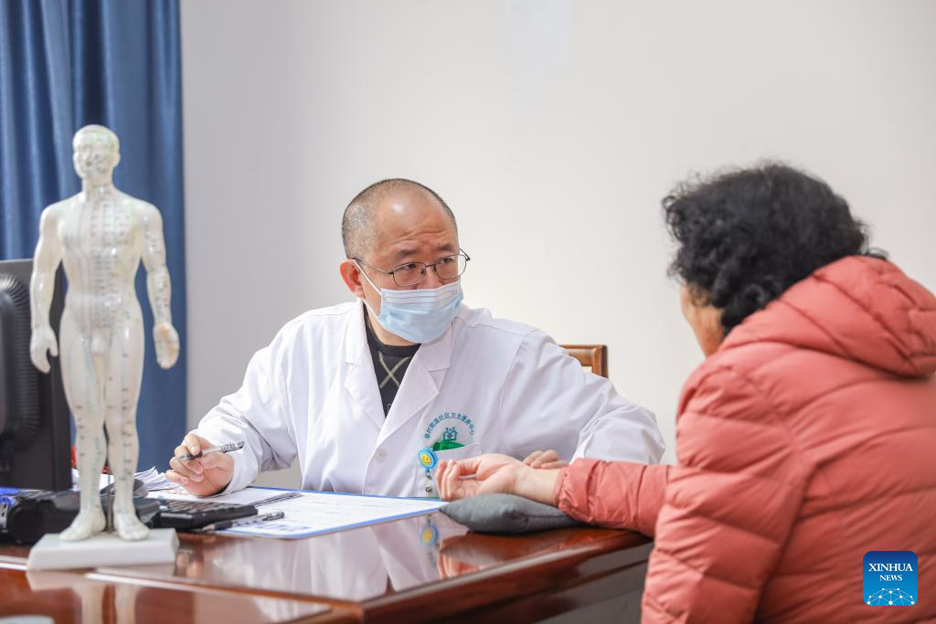 A doctor treats a patient at a community clinic of traditional Chinese medicine in Licang District of Qingdao City, east China's Shandong Province, March 16, 2026. Shandong Province has been striving to strengthen the foundation of medical and health service system, and enhance grassroots medical service capacity. (Photo by Zhang Ying/Xinhua)