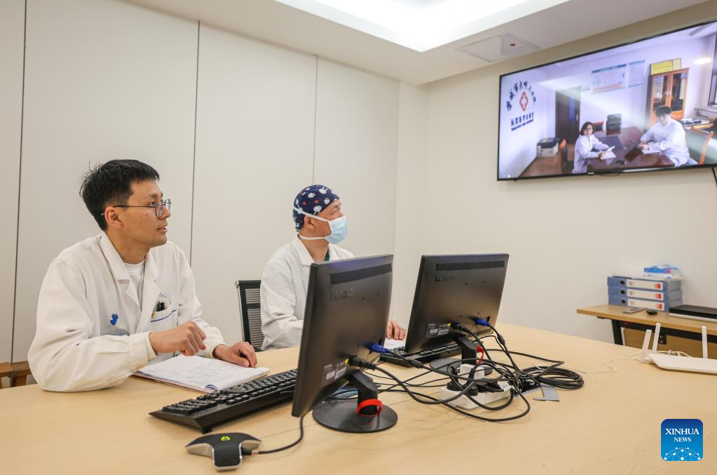 Experts of Renmin Hospital of Rongcheng City have a video conference with medical staff from a township health center to conduct remote consultations in east China's Shandong Province, March 16, 2026. Shandong Province has been striving to strengthen the foundation of medical and health service system, and enhance grassroots medical service capacity. (Photo by Li Xinjun/Xinhua)