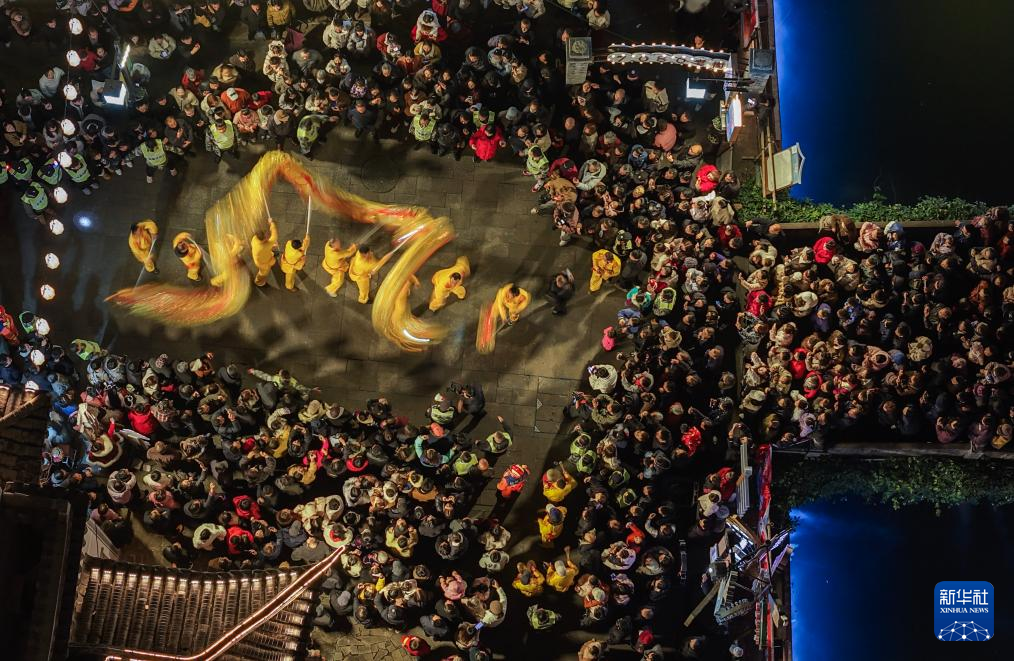 这是3月3日在浙江省建德市寿昌镇老街拍摄的闹元宵舞龙活动现场(无人机照片)。