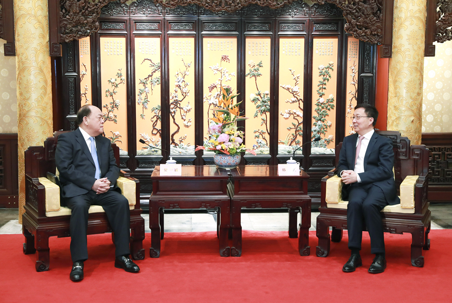 3月6日,中共中央政治局常委、國務(wù)院副總理韓正在北京釣魚臺(tái)國賓館會(huì)見澳門特別行政區(qū)行政長官賀一誠。新華社記者 龐興雷 攝