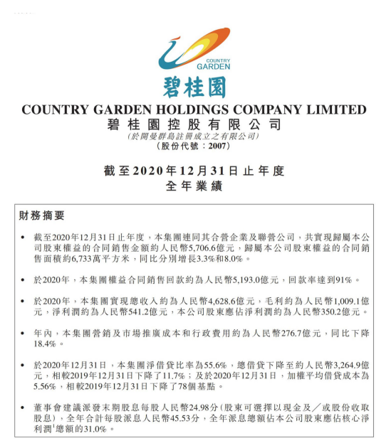 公告顯示,全年碧桂園營業(yè)收入4628.6億元,毛利約為1009.1億元,凈利潤541.2億元。得益于公司持續(xù)加強(qiáng)對(duì)回款目標(biāo)的考核,強(qiáng)化標(biāo)準(zhǔn)化、精細(xì)化的管理機(jī)制,碧桂園的回款率依舊保持高位。截至期末,共實(shí)現(xiàn)權(quán)益合同銷售現(xiàn)金回款額約人民幣5193億元,權(quán)益回款率達(dá)91%,連續(xù)五年高于90%,在行業(yè)繼續(xù)保持領(lǐng)先,反映了強(qiáng)勁的自身造血功能。