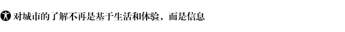 ![]() 城市越冒險,生活其中的人們對城市就會越陌生??梢姷氖聦嵤牵藗儗Τ鞘械牧私獠辉偈腔谏詈腕w驗,而是信息。此前延續多年的城市生活規律和節奏被互聯網打破了,互聯網把城市的每一部分都終端化,城市的每一個具有生命特征的組織不再受生理和情理的連接,而是信息的連接。一方面,信息成為連接人與人、人與城市、城市與城市的單一工具,信息把城市圈成了地域以外的另一種空間,只是,信息的流動性并沒有協助人了解城市,反倒是增加了越來越多的陌生。 另一方面,陌生又完成了城市開放意象的表達,這也是一座城市為什么能吸引外來者旅游、造訪、定居的重要原因。信息的獨立和集合讓人、讓城市的局部在封閉系統之外,又像互聯網時代的物流一樣多樣化、復合化。 |