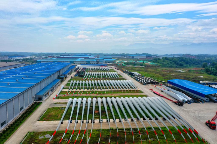 大型風電葉片生產企業中材科技(萍鄉)風電葉片有限公司航拍景象。(王強攝 新華社通聯照片)