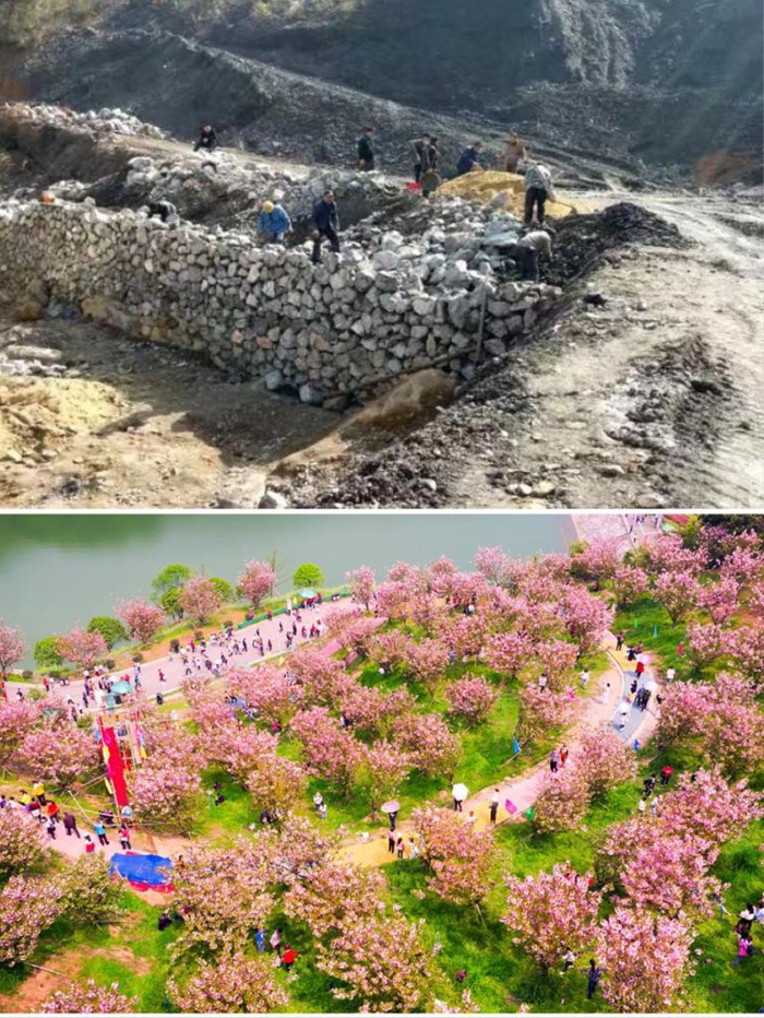 拼版圖片:上圖,安源區城郊管委會略下村生態修復前礦山裸露;下圖,生態修復后“陽光花海”景象。(萍鄉市委宣傳部供圖)