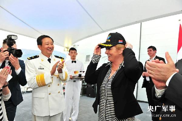 ??? Rear Admiral Jiang Guoping, commander of the 19th Chinese naval escort fleet, presents a ball cap with fleet logo to President Kolinda Grabar Kitarovic. Croatian President Kolinda Grabar Kitarovic, with other high-ranking civil and military officials, boarded the visiting guided-missile frigate Linyi of the 19th naval escort fleet of the PLA Navy and attended a deck reception on June 4, 2015. (military.cnr.cn/ Xiong Libing)