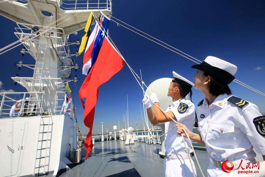 ??? Sailors of the hospital ship Peace Ark raise flags. The hospital ship Peace Ark of the Chinese PLA Navy arrived at the Port of Brisbane at around 10:00 on October 7, 2015, local time, kicking off a 5-day friendly port visit to Australia. (Photo by Jiang Shan)