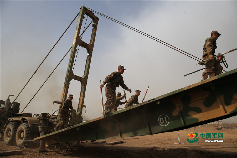 ??? Engineers assemble a trailer-launched bridge of the rapidly emplaced bridge system during a bridge-building training exercise. Soldiers with a PLA engineer regiment stationed in Xinjiang Uygur Autonomous Region conducted a bridge-building training exercise on February 22, 2016.