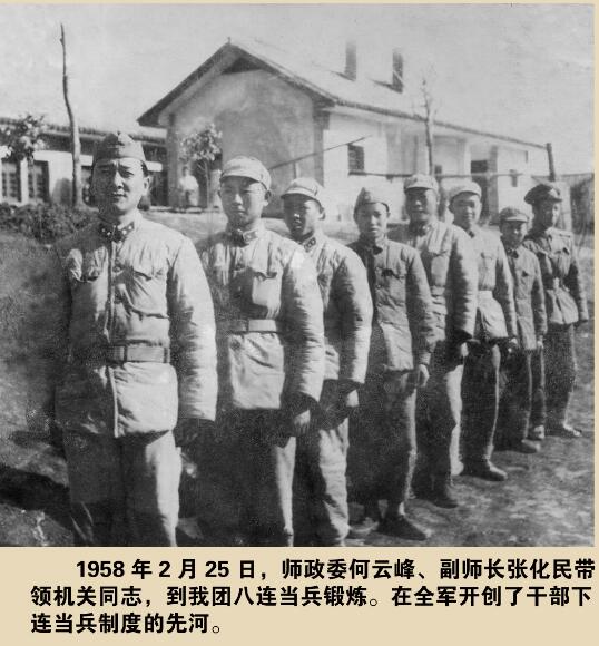 ????1958年8月,毛澤東主席在北戴河召開(kāi)的中央政治局?jǐn)U大會(huì)議上講話(huà)指出:“我們的軍官,像云南的一個(gè)師長(zhǎng),一年當(dāng)一個(gè)月兵,我看這是好辦法。……這樣,我們的軍隊(duì)就是永遠(yuǎn)打不散的軍隊(duì)。”毛主席口中的師長(zhǎng),實(shí)際是當(dāng)時(shí)的師政委何云峰,而下連當(dāng)兵的地方便在該團(tuán)三營(yíng)八連,八連也被譽(yù)為下連當(dāng)兵第一連。