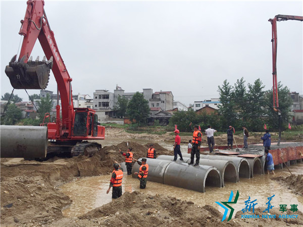 在湖北麻城,官兵修復搶通涵管橋。