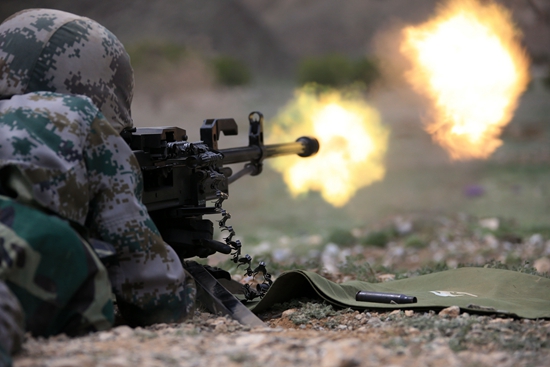 2016年4月25日,西部戰(zhàn)區(qū)陸軍某團機槍連官兵攜帶重機槍對“敵”目標(biāo)實施火力打擊。視覺中國供圖(資料圖片)