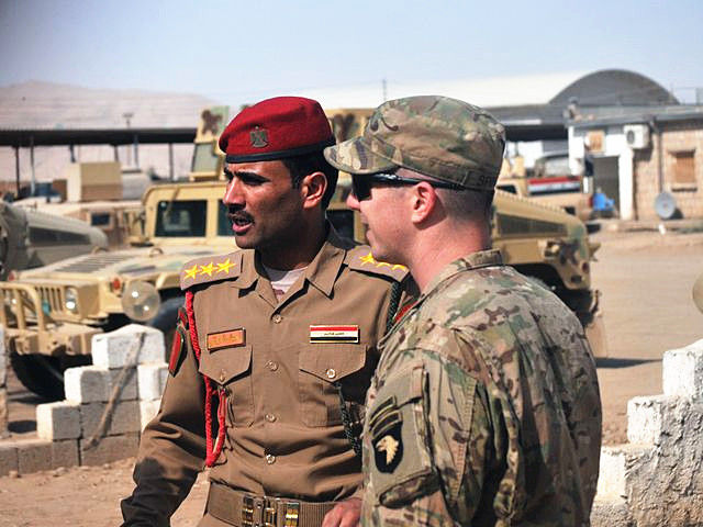 2016年9月6日,伊拉克斯威夫特營地,美軍打擊部隊軍官與伊拉克軍官交談。(新華/美聯)