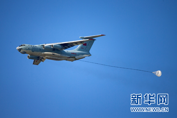 8月4日,中國空軍伊爾-76戰機在“航空飛鏢”靶場開放日進行重裝空投。新華社發(楊盼 攝)