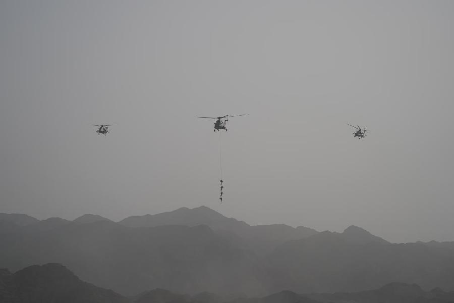 ????23日,陸軍新質作戰力量演練在陸軍多個演兵場連續“打響”,8支新質作戰力量輪番上陣。圖為特戰隊員在武裝直升機護衛下進行直升機懸吊撤離。新華社記者王東明 攝