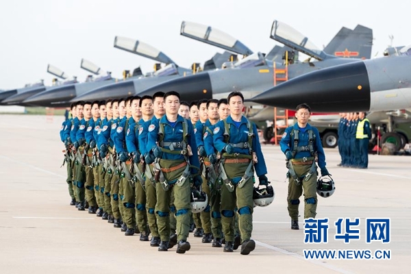 空軍“先鋒飛行大隊”飛行員列隊走向戰機(9月14日攝)。 新華社發(楊盼 攝)
