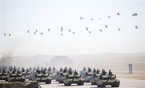 ????2017年7月30日,慶祝中國人民解放軍建軍90周年閱兵在位于內蒙古的朱日和訓練基地舉行。這是坦克方隊和空中突擊梯隊。新華社記者 姚大偉 攝