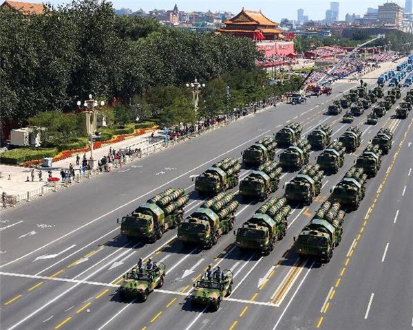 ????資料圖片:2015年9月3日,中國人民抗日戰(zhàn)爭(zhēng)暨世界反法西斯戰(zhàn)爭(zhēng)勝利70周年紀(jì)念大會(huì)在北京隆重舉行。這是裝備方隊(duì)通過天安門廣場(chǎng)。