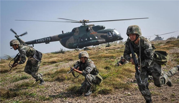 ????資料照片:演習(xí)中,“硬骨頭六連”官兵向“敵”實(shí)施機(jī)降突擊(2011年10月9日攝)