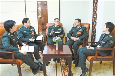 本報記者鄒維榮(左一)、柴華(右一)采訪軍隊政協委員曲新勇、王健、吳剛(左二至左四)。中國軍網記者 孫智英 攝