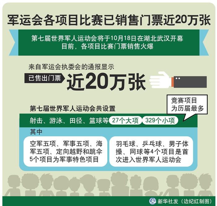 新華社武漢10月16日電(記者梁建強)第七屆世界軍人運動會將于18日在湖北武漢開幕。目前,各項目比賽門票銷售火爆。來自軍運會執委會的通報顯示,已售出門票近20萬張。