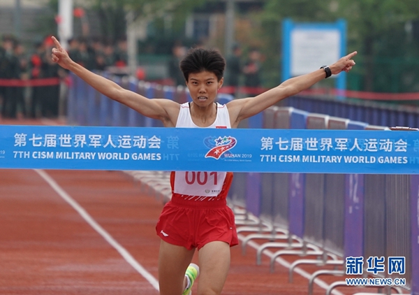 10月23日,中國選手潘玉程在男子個人全能越野跑比賽后慶祝,他以26分00秒的成績獲得該項目第13名。當日,第七屆世界軍人運動會軍事五項男子個人全能項目比賽在武漢陸軍工程大學軍械士官學校結束,中國選手潘玉程以5617.5分的總成績獲得冠軍,隊友阿牛爾古以5565.2分的總成績獲得亞軍。新華社記者 賀長山 攝