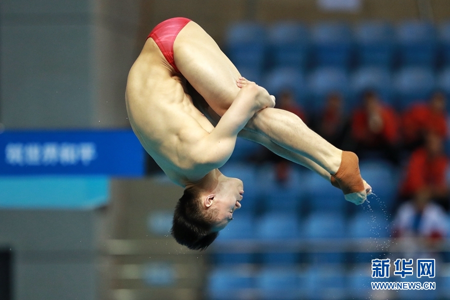 10月25日,謝思埸在比賽中。當日,在武漢舉行的第七屆世界軍人運動會跳水項目男子3米跳板決賽中,中國選手謝思埸以556.75分的成績奪得冠軍,中國選手王宗源以502.90分的成績獲亞軍。新華社記者 劉續 攝