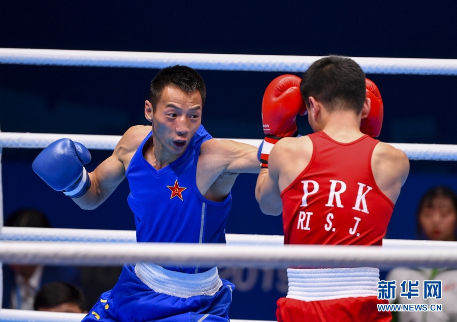 10月26日,中國選手張果(左)和朝鮮選手李承珍在比賽中。當(dāng)日,在武漢舉行的第七屆世界軍人運動會拳擊項目男子49-52公斤級決賽中,中國選手張果以5比0戰(zhàn)勝朝鮮選手李承珍,獲得冠軍。新華社記者 胡虎虎 攝