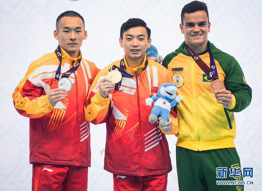 10月26日,冠軍中國選手鄒敬園(中)、亞軍中國選手肖若騰(左)和季軍巴西選手索薩在頒獎儀式上。當(dāng)日,在武漢進(jìn)行的第七屆世界軍人運動會體操項目雙杠決賽中,中國選手鄒敬園以15.866分的成績獲得冠軍,中國選手肖若騰以14.833分的成績獲得亞軍。新華社記者 肖藝九 攝