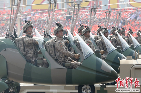 10月1日,慶祝中華人民共和國成立70周年大會上,裝備方隊官兵身著新式迷彩服接受檢閱。中國青年報·中國青年網(wǎng)記者 趙迪/攝