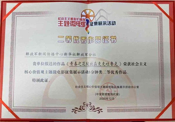 ????活動自2020年5月開展以來,共收到社會各方面報送的作品4354部。征集工作結束后,由相關領域專家學者組成的評審組對征集到的作品進行評審,評選出優秀作品134部、優秀單項5個、優秀組織單位12個。其中,由解放軍新聞傳播中心新華社解放軍分社申報的《青春之花綻放在克克吐魯克》獲“3分鐘類優秀作品二等獎”。