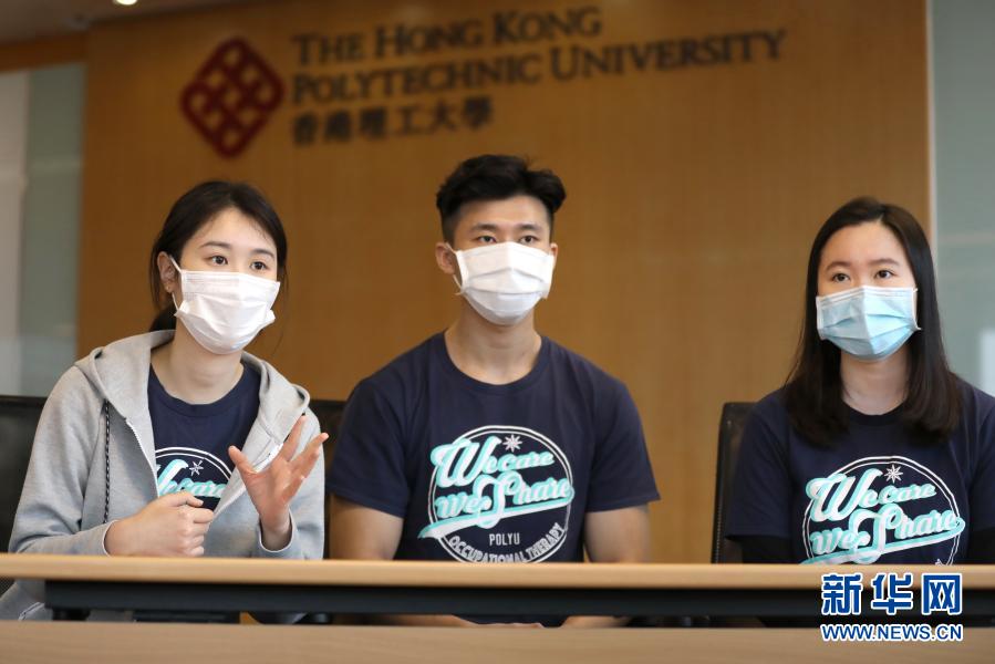 香港理大康復治療科學系職業治療學四年級學生李舒平、香港理大康復治療科學系職業治療學三年級學生李穎東、香港理大康復治療科學系職業治療學三年級學生梁熙童在接受新華社記者采訪(自左至右;2020年12月12日攝)。新華社記者 吳曉初 攝