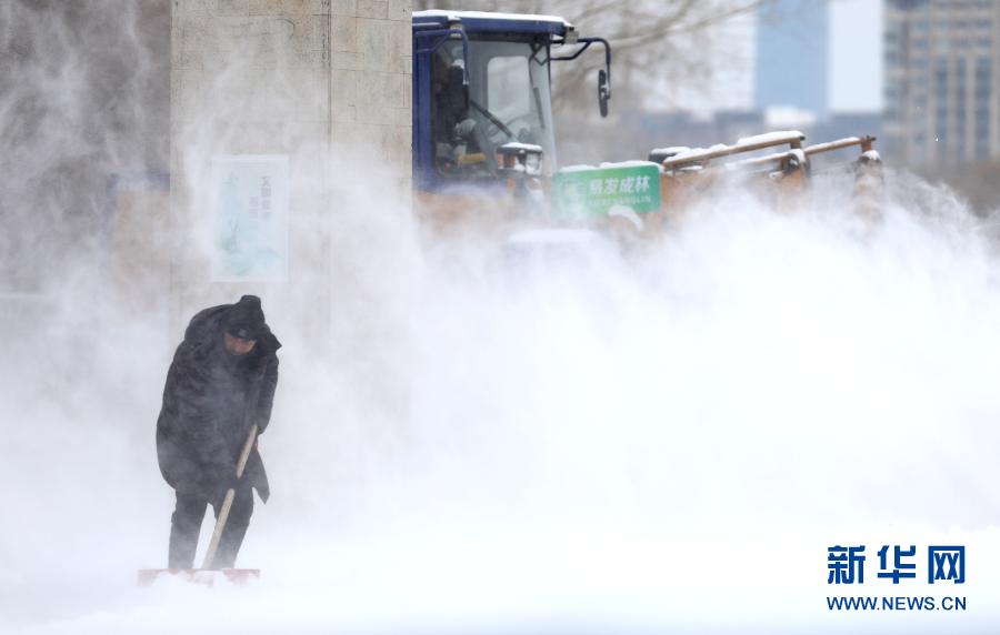 1月28日,工人在沈陽市渾南區奧林匹克公園清掃積雪。