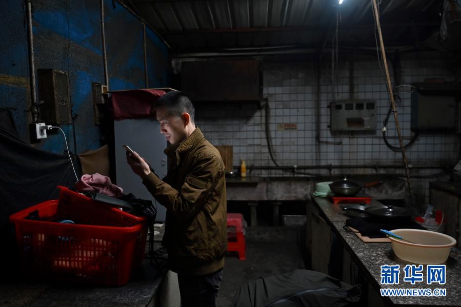 1月26日,在福建省石獅市的金利萊斯服裝廠,黃海龍?jiān)趶N房用手機(jī)查看剛剛收到的工資明細(xì)。這一年他們夫妻每天工作超過12小時(shí),收入合計(jì)約16萬。