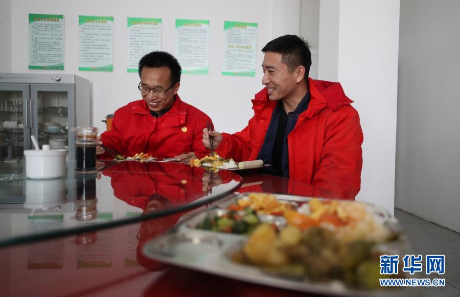 2月3日,在遼河油田建設有限公司管道第三項目部,來自河北衡水的概預算管理人員王殿凱(左)和來自河北邢臺的工程技術人員張浩在食堂吃飯。今年他們都留在當地過年。
