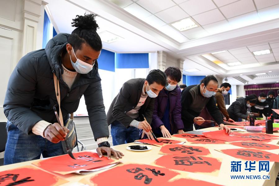 2月4日,外國留學生在學寫福字。