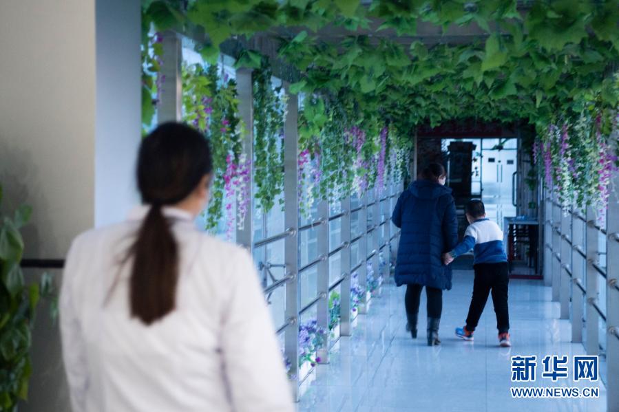 在哈爾濱博能中醫門診部,劉雨晴(左)在結束一天的康復訓練后目送腦癱兒童離開(2月2日攝)。