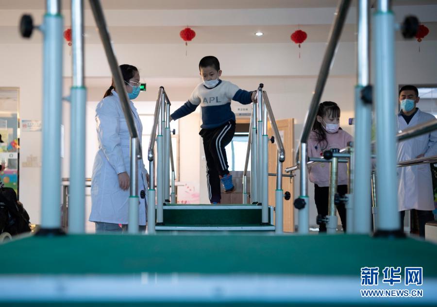 在哈爾濱博能中醫門診部,劉雨晴(左一)為腦癱兒童進行康復訓練(2月2日攝)。