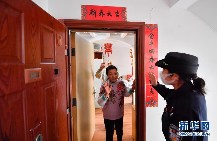 2月11日,在天津市紅橋區隆春里社區結束入戶走訪后,楊曉惠(右)和居民告別。新華社發(孫凡越攝)