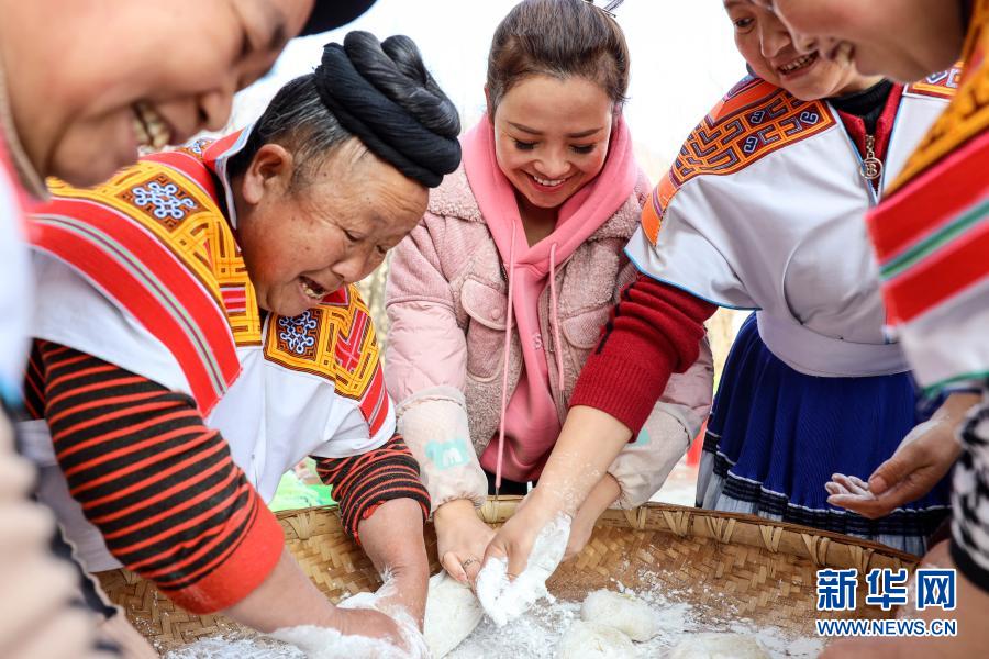 2月10日,吳窮(中)和坪子社區村民一起制作糍粑。