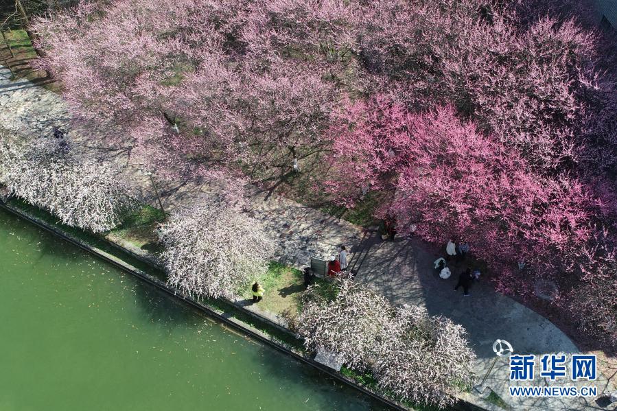 2月14日,在湖南省湘西土家族苗族自治州吉首大學,市民在梅園里賞花(無人機照片)。新華社發(彭彪 攝)