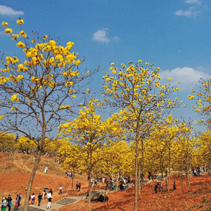 近日,廣西南寧市青秀山風景區黃花風鈴木盛放,吸引眾多游人前來觀賞。