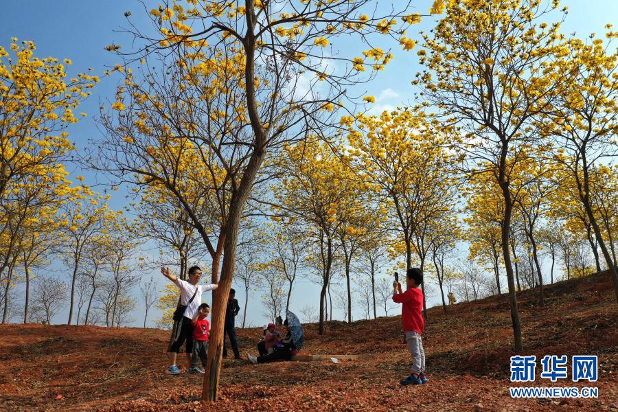 2月21日,游人在南寧市青秀山風景區(qū)觀賞盛開的黃花風鈴木。