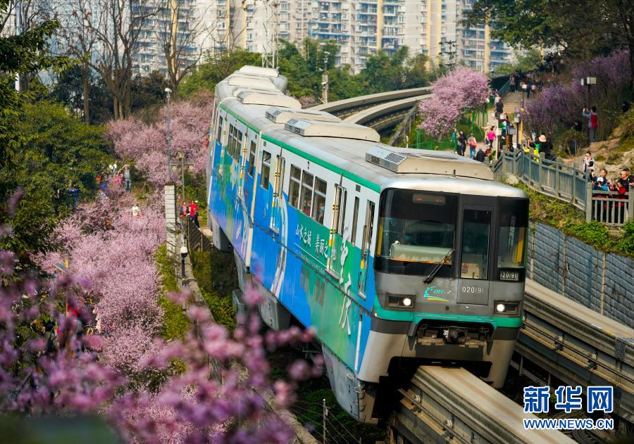 2月23日,在重慶軌道交通2號線佛圖關段,一列單軌列車穿越花海奔馳而過。