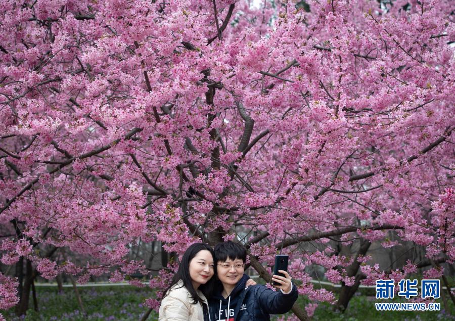2月27日,游客在武漢東湖櫻花園拍照。