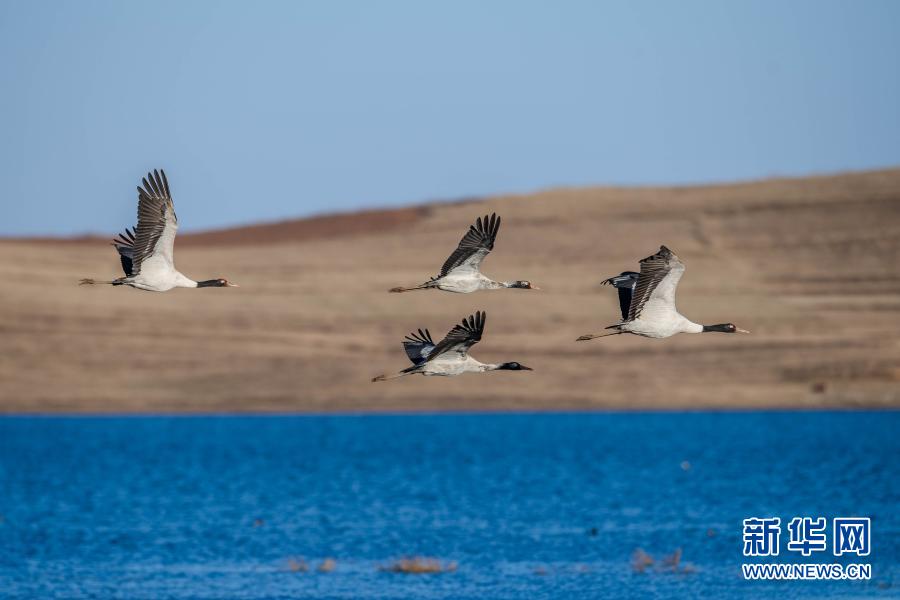 黑頸鶴在大山包黑頸鶴國家級(jí)自然保護(hù)區(qū)飛翔(2月24日攝)。新華社記者 胡超 攝